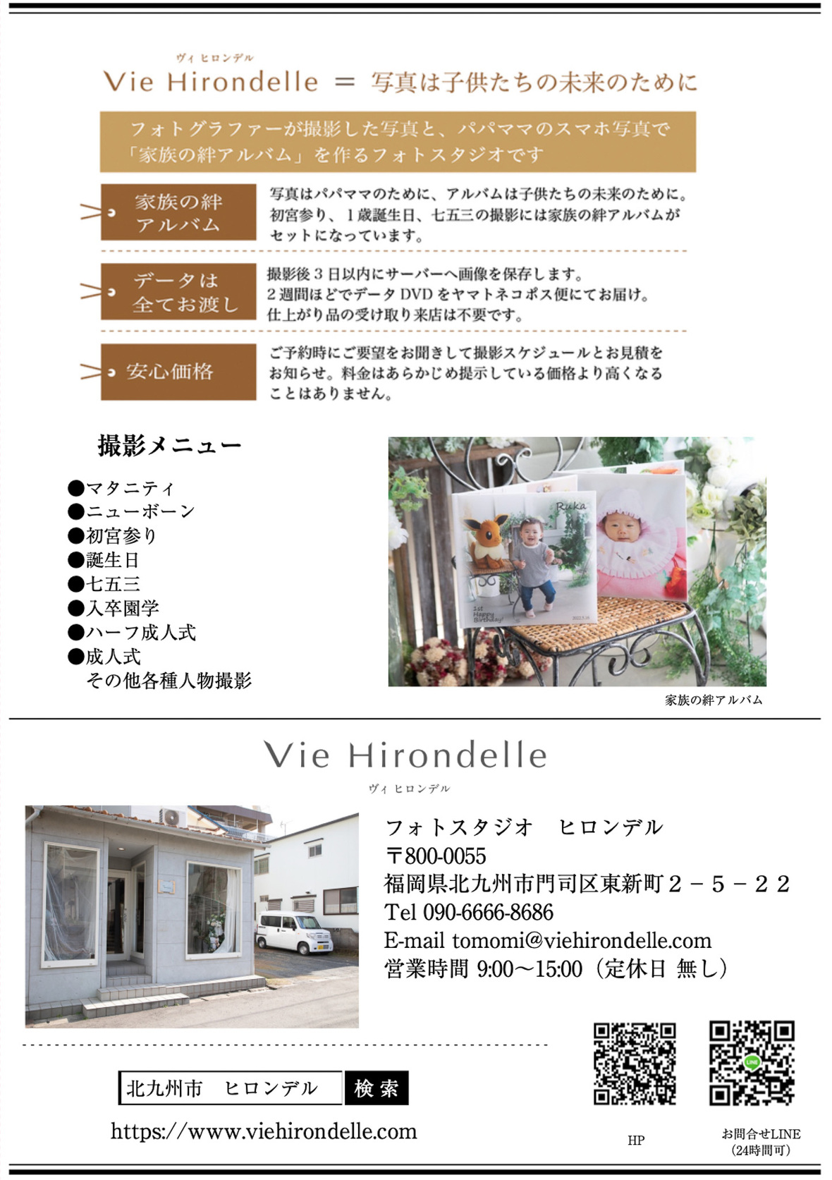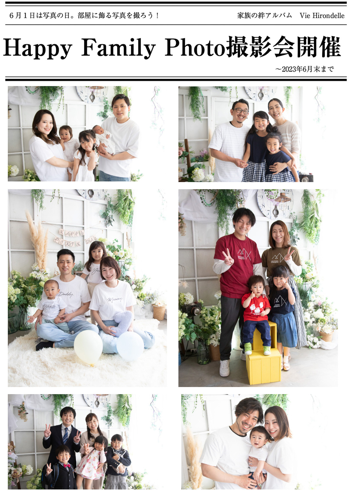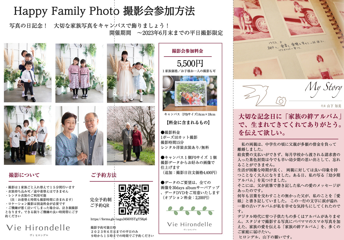 2023年05月01日(月) インフォメーション Happy Family Photo撮影会開催のお知らせ 写真の日記念! 大切な家族写真をキャンバスで飾りましょう。 開催期間 〜2023年6月末までの平日撮影限定 ご予約はQRコードから