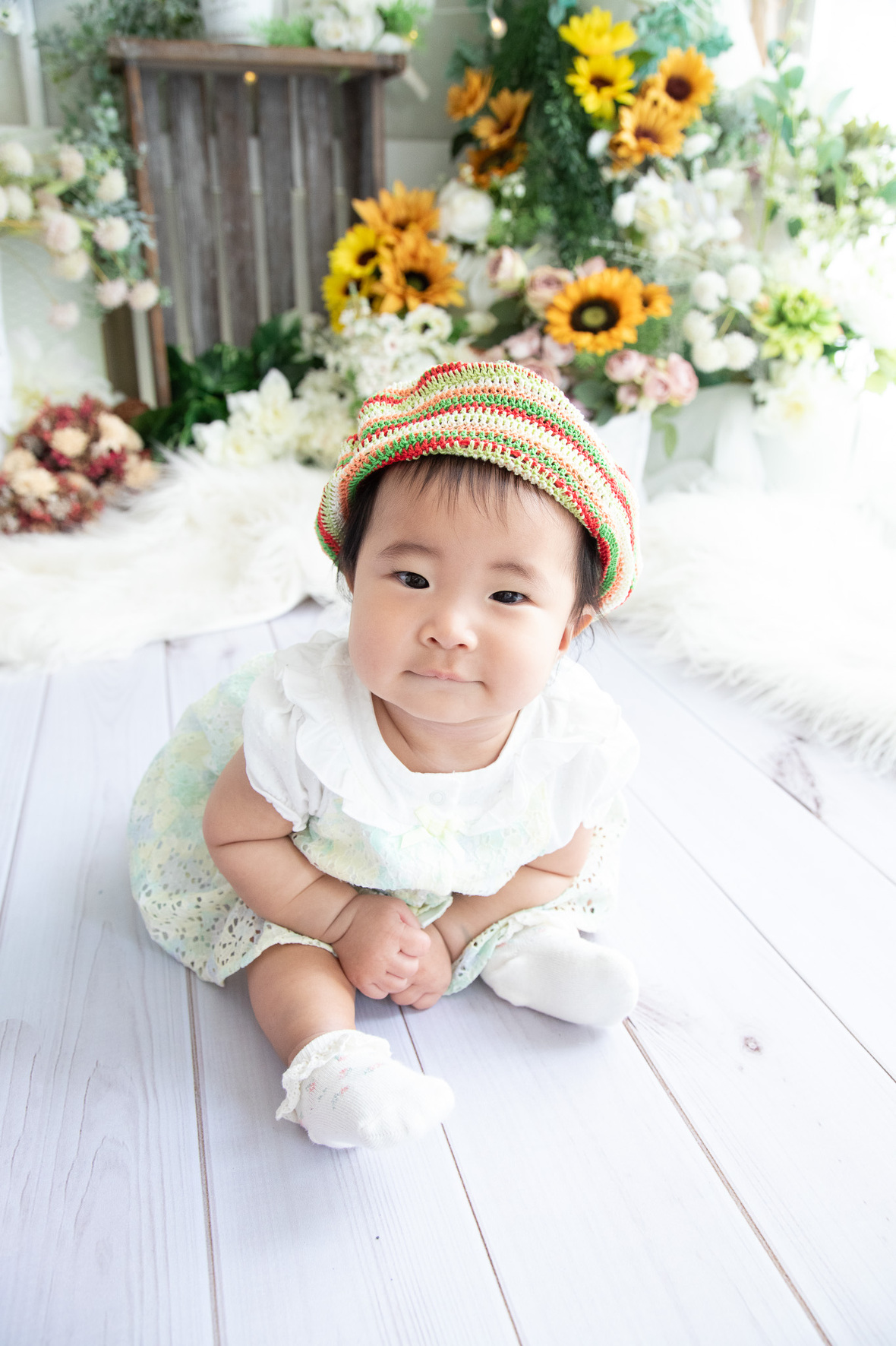 2023年07月24日(月) フォトギャラリー < フォトスタジオ < サービス案内 ハーフバースデイおめでとう 初宮まいり撮影で初めてお越しくださったKさん。 今回はハーフバースデイ記念でスタジオにお越しくださいました♡ 一人座りもしっかりしてて、パパの声かけにニコニコ笑顔も見せてくれましたよー かっ可愛い♡ ご持参の帽子は、おばあちゃまの手作りです。 1歳お誕生日でお会いできる日を楽しみにしてまーす。